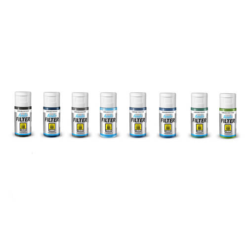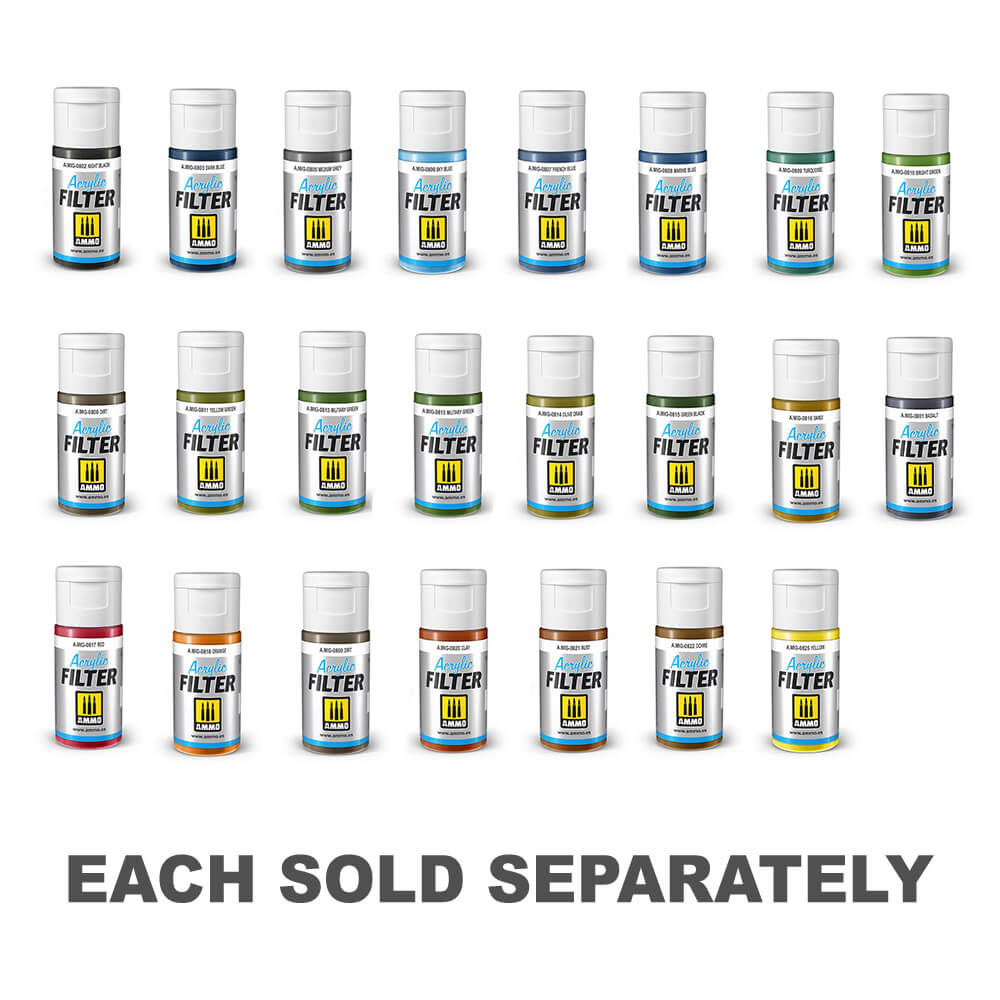 AMMO's new acrylic filters are designed to be applied directly to the model. This new range allows you to add colour variation to your miniatures, harmonize various camouflage colours, or distinguish areas with a different tone. The acrylic filter can be easily applied with a brush, which avoids the need for complicated masking. Moisten the brush with the product and apply it without flooding the surface. Thanks to the innovative formulation, the Acrylic Filters can be retouched or eliminated simply and easily with water during the extended dry time, each filter will dry completely in 24 hours. These versatile filters can also be applied by airbrush for an endless number of effects. Thanks to the wide range of 30 colours available, you won´t need to make complex mixtures, adjust for the proper thinning ratio, or adjust the tone to the intended shade. Each colour can be mixed with one another, or tinted with other AMMO acrylics. The acrylic filters can be diluted and cleaned with wat