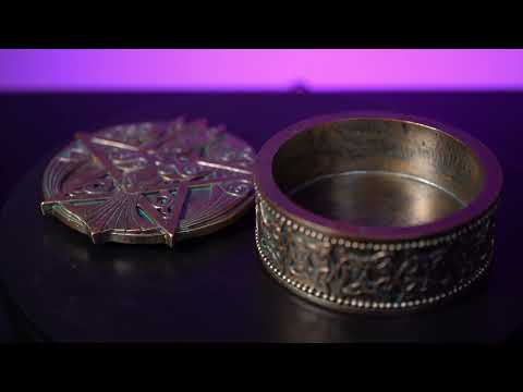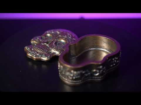 Metal look trinket box with candy skull design. Antique gold finish & intricate details make this a beautiful functional ornament. Made from sturdy polyresin with a luxurious, weighty feel.