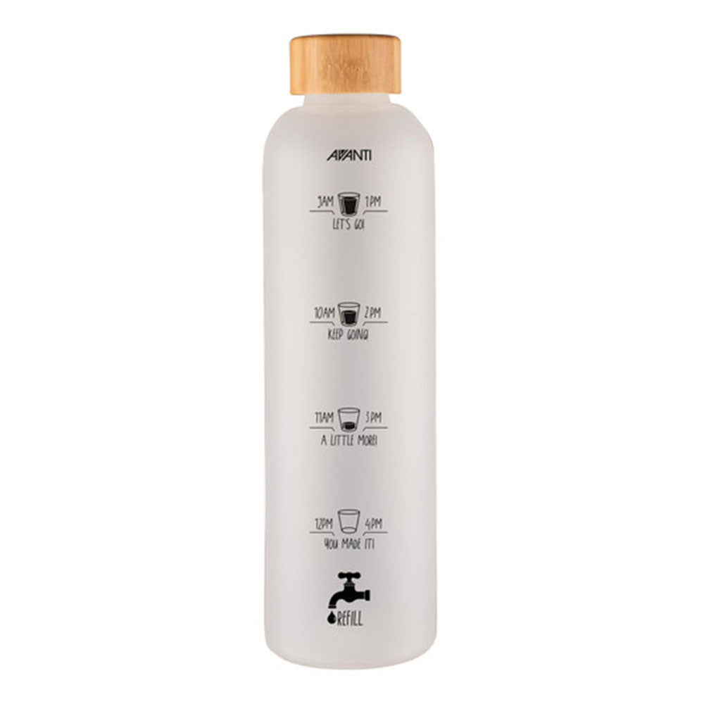 Stay hydrated and track you daily water intake easily with the Avanti Drink More Water Velvet Glass Water Bottle. The exterior is marked with motivational phrases along with hourly time markers, to remind you not only WHEN, but also HOW MUCH to drink to keep you on track to reach the recommended 2Ls of water each day. Lightweight and durable, it is made from high grade borosilicate glass that is non-porous and non-toxic. It features a silicone spray coating on the exterior, providing a non-slip surface for the ultimate grip, as well as added protection against breakages. The screw on lid is made from sustainably sourced bamboo and is leak proof, making it great for work or on-the-go.