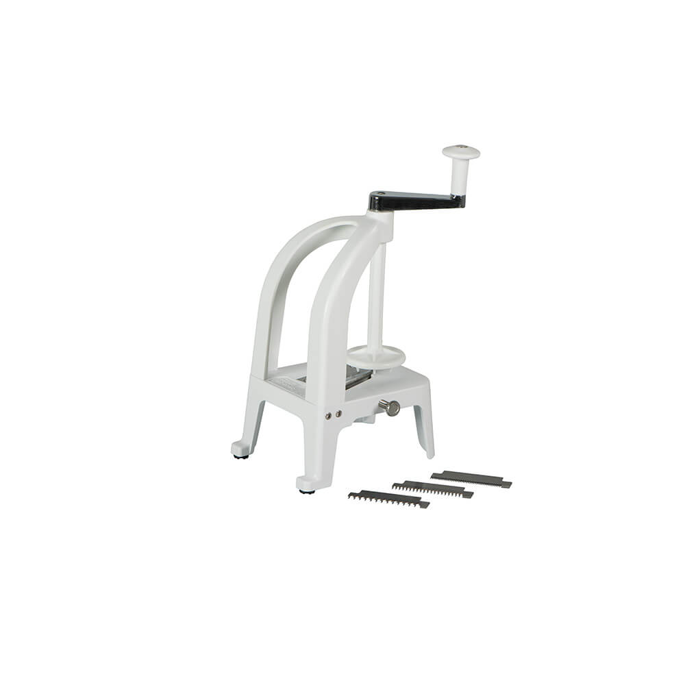 - 4 different blades (straight edge, coarse, medium and fine tooth); make wide slices, chunky cuts, long narrow and extra-narrow julienne strips