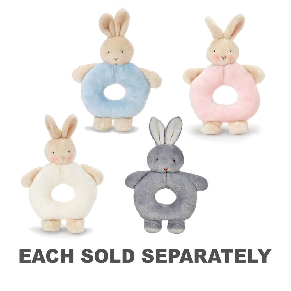 • Adorable in pastel pink, blue and white are sweet little bunny rattles that baby will shake with glee!