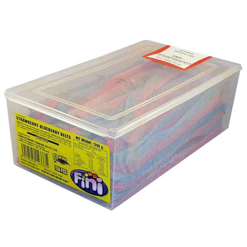 Fini Strawberry and Blueberry Belts are a delectable candy treat that combines the sweet and juicy flavors of strawberries and blueberries. These candy belts typically feature a vibrant red and blue color scheme, representing the two fruity flavors. The chewy texture and delightful blend of strawberry and blueberry flavors make them a popular choice for those who enjoy a fruity and chewy candy experience.