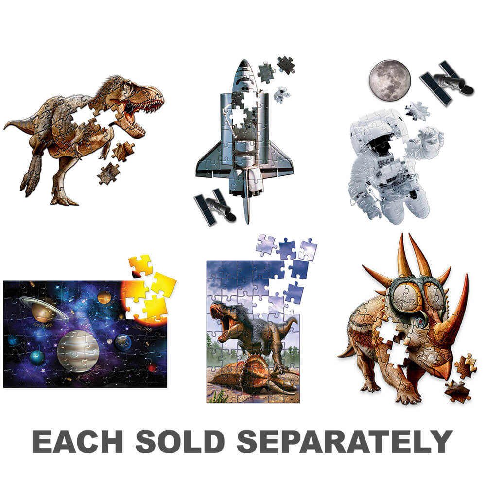 Kids who love dinosaurs will be amazed by the ferocious T-Rex vs. Triceratops artwork and fascinated by the spiky Rubeosaurus! Space-loving kids meanwhile will be thrilled by the astronaut puzzle, wowed by the solar system or impressed by the space shuttle puzzle.