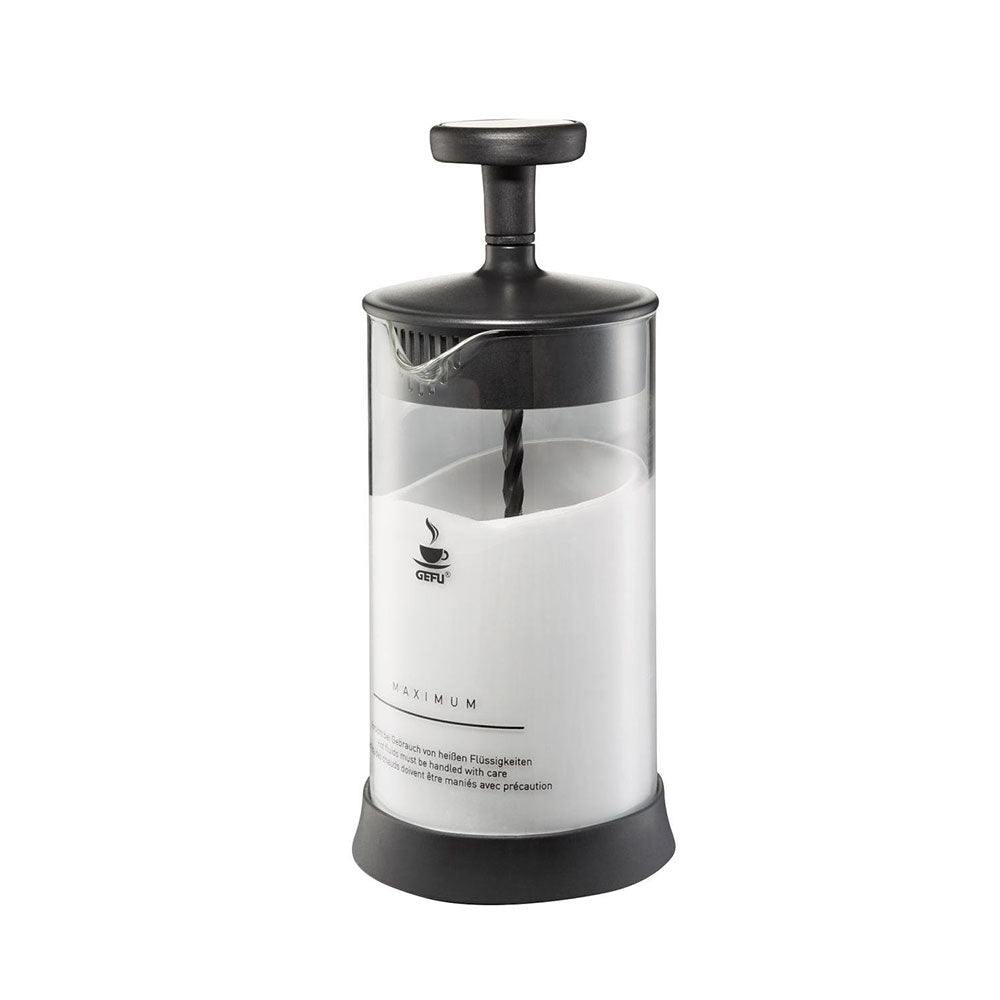 GEFU Antonio Milk Frother is the innovative spinning mechanism in the milk frother turns both warm and cold milk into a creamy froth. Milk Frother Antonio Milk foam for coffee specialities or a freshly mixed chai-latte: the novel spinning mechanism makes it possible with little effort. The milk frother can be taken apart for easy cleaning and the anti-slip base can, therefore, be removed too. The heat-resistant glass container can be put into microwaves too and so both cold and warm milk can be frothed. The extra-deep lid edge prevents splashing and the integrated sieve separates foam from non-foamed milk.