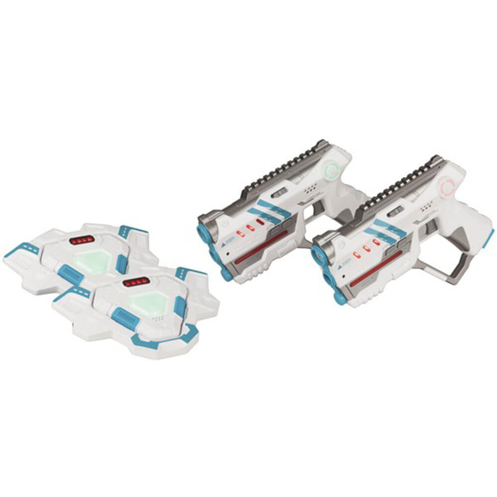 Battle your friends and family with this exciting laser tag game. The pack includes guns and vests for two players, and additional sets can be used to make up to four teams. The vest straps easily around your chest and vibrates, with sound and lighting effects, when you get a direct hit from the opponent's gun. The guns use infrared light and shoot up to 40m, and can be set to single shot, laser, machine gun, and plasma modes. Recommended for ages 8+ and requires 12 x AAA batteries (Not included) in total for up to 5 hours of battle action, 3 x AAA batteries per gun and 3 x AAA batteries required per vest.