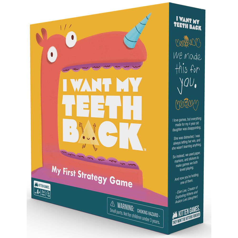 • I Want My Teeth Back Game Contents: Join the tooth-rrific adventure with 1 Spinner, 1 Landing Mat, 4 Meefs, 57 Cards, 1 Menu Card, and 60 Teeth Tokens. This exciting card collection game is packed with everything you need for endless fun-filled gameplay. Spin the Spinner, navigate the Landing Mat, and embark on a thrilling quest to find Meef's lost teeth! With a wide range of components, this game offers hours of entertainment and excitement for players of all ages