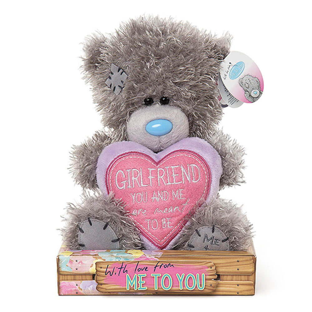 - 15cm plush teddy with cushion heart * Message reads “Girlfriend, you and me are meant to be” *