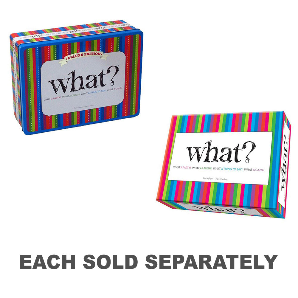 • With players trying to come up with the most comical and outrageous answers possible, WHAT. is absolutely the funniest fame you will ever play. The perfect game for get-togethers and parties.