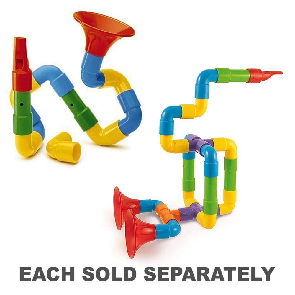 - SUPER SAXOFLUTE: Recommended age 3+, contains: 2 mouthpieces, 2 Trumpet ends, 1 Cross tubes, 1 T-shapes, 13 L-shapes in 2 colours, 11 Straight tubes with holes. This toy is compatible with other Quercetti tubular construction sets (sold separately).