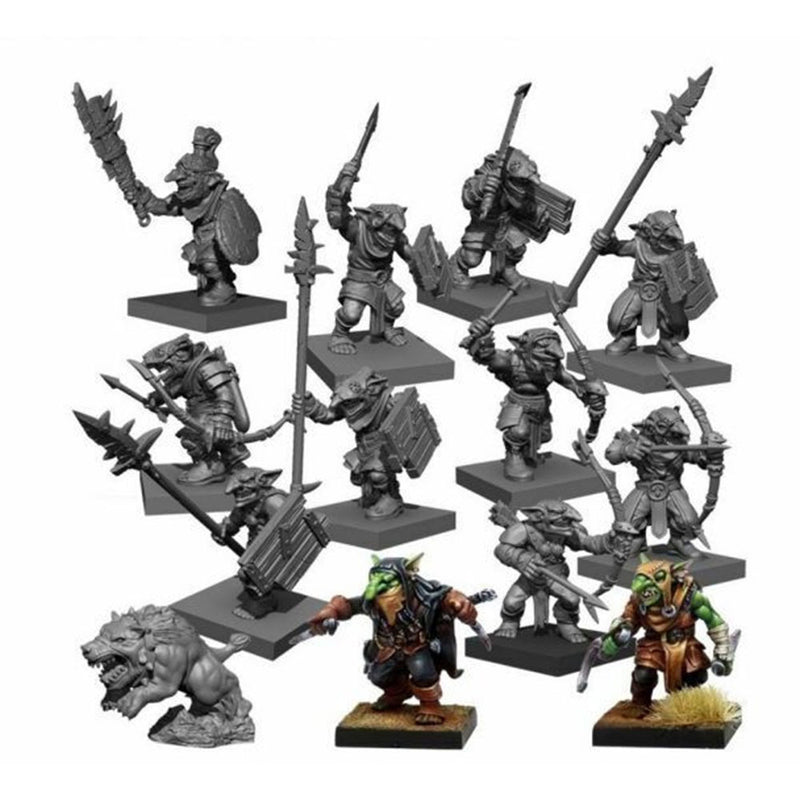 Small, unpleasant and spiteful, Goblins are utterly separate from their green skin cousins, the Orcs. Goblins are not only smaller and less imposing but also far cleverer and more dexterous. They might not beat you in a straight fight, but to underestimate even a small force of Goblins would be a grave mistake. Contains: 10x BRAND NEW Hard Plastic Goblins 2x Hard Plastic Mawbeasts 1x Resin Stinggit 1x Resin Sneak, Bases Vanguard Cards Please Note: One Goblin Warband Set supplied. Miniatures are supplied unpainted and some assembly may be required.