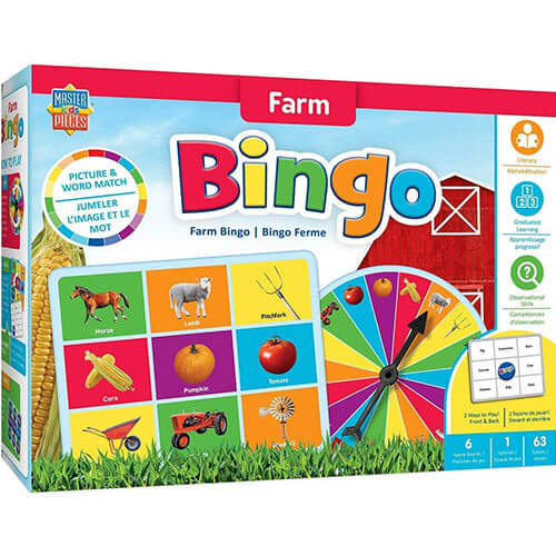 ¡Haz las 9 combinaciones y sé el primero en gritar BINGO! Farm Bingo les enseña a los niños sobre las diferentes cosas que pueden encontrar en una granja, reconocer el cerdo, un granero, un tomate y más. Este juego de Bingo está diseñado para niños a partir de 3 años y es divertido para toda la familia. Comience haciendo coincidir imágenes y luego pase al otro lado de su tablero de bingo y encuentre la palabra correcta. Es un gran juego para aprender a leer y escribir y hacer observaciones mientras se divierte. Este juego incluye 1 ruleta, 6 tableros de juego y 63 fichas.