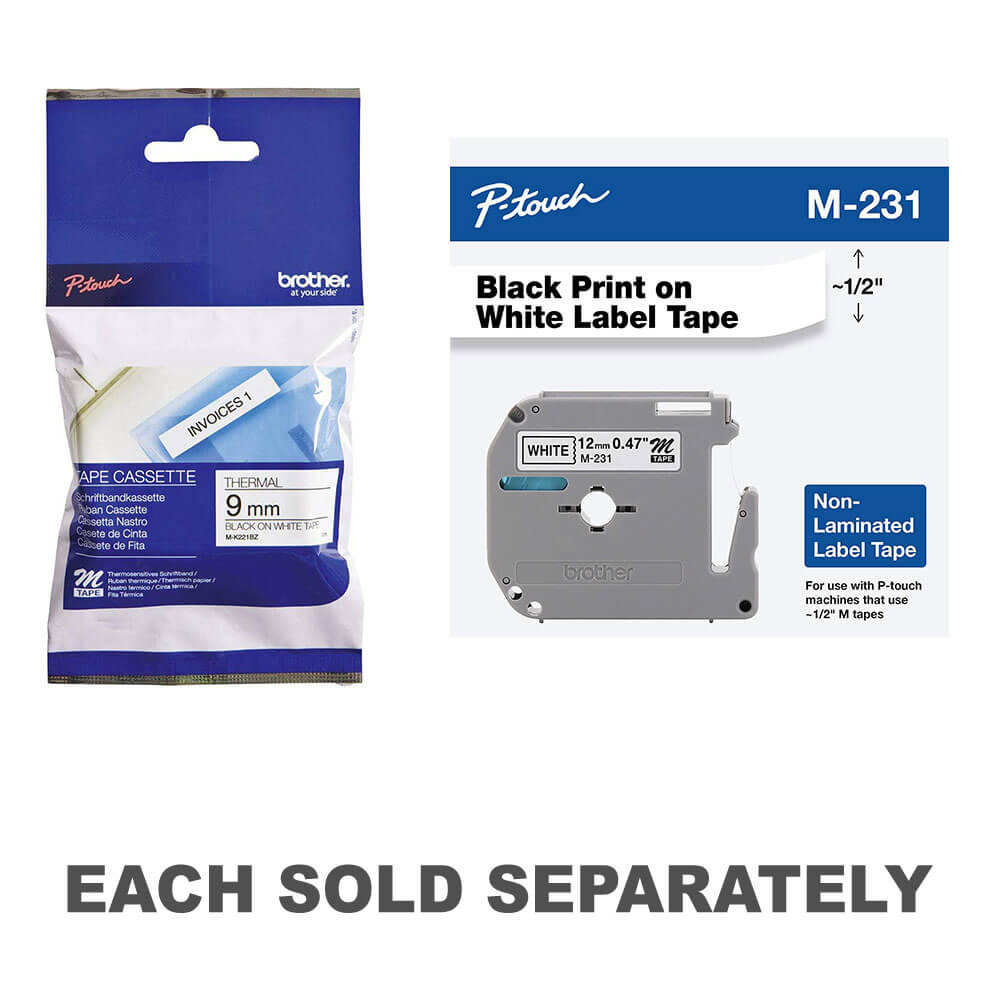 La cinta P-touch M-231 ½ "(0.47") negra sobre blanca le permite crear etiquetas audaces, pero fáciles de leer, que son fáciles de pelar, perfectas para uso en interiores. Esta media pulgada (0.47 pulgadas ) La cinta P-Touch no laminada directa es resistente al daño por el agua y no se manchará o manchará. son perfectos para etiquetar la cocina, la estantería y los gabinetes de suministros. La parte posterior de la cinta P-touch se puede quitar con facilidad, lo que hace que la cinta de la etiqueta de reemplazo de Brother M sea fácil de pelar y aplicar a las mesas y estantes de acero, madera, plástico y más.