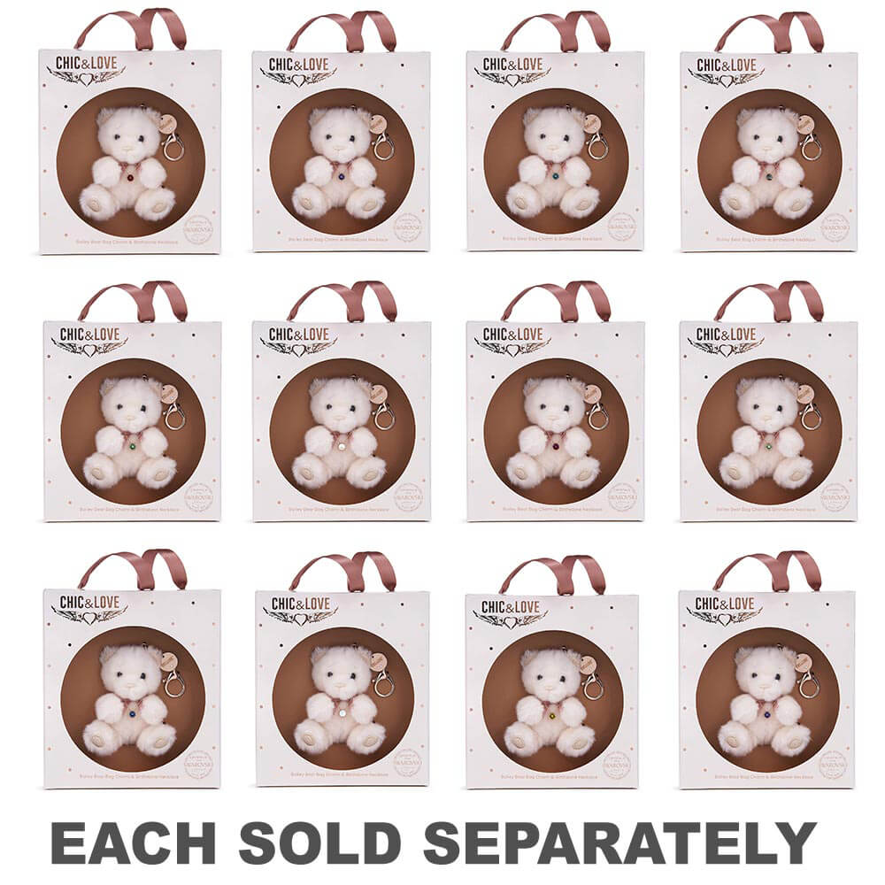 Colgante para bolso del Oso Bailey y collar con piedra de nacimiento de Swarovski. Bailey Bear tiene una suave tela de felpa de primera calidad, complementada con una cinta de satén de color oro rosa. El clip para bolso presenta un cierre de mosquetón de oro rosa con un medallón de cristal de Swarovski. El collar está hecho de latón y está chapado en oro rosa con una piedra natal de junio en forma de Swarovski. Presentado en caja de regalo con mango satinado en oro rosa y acabado de sello mate. Presenta detalles estampados en papel de aluminio y brillo puntual.