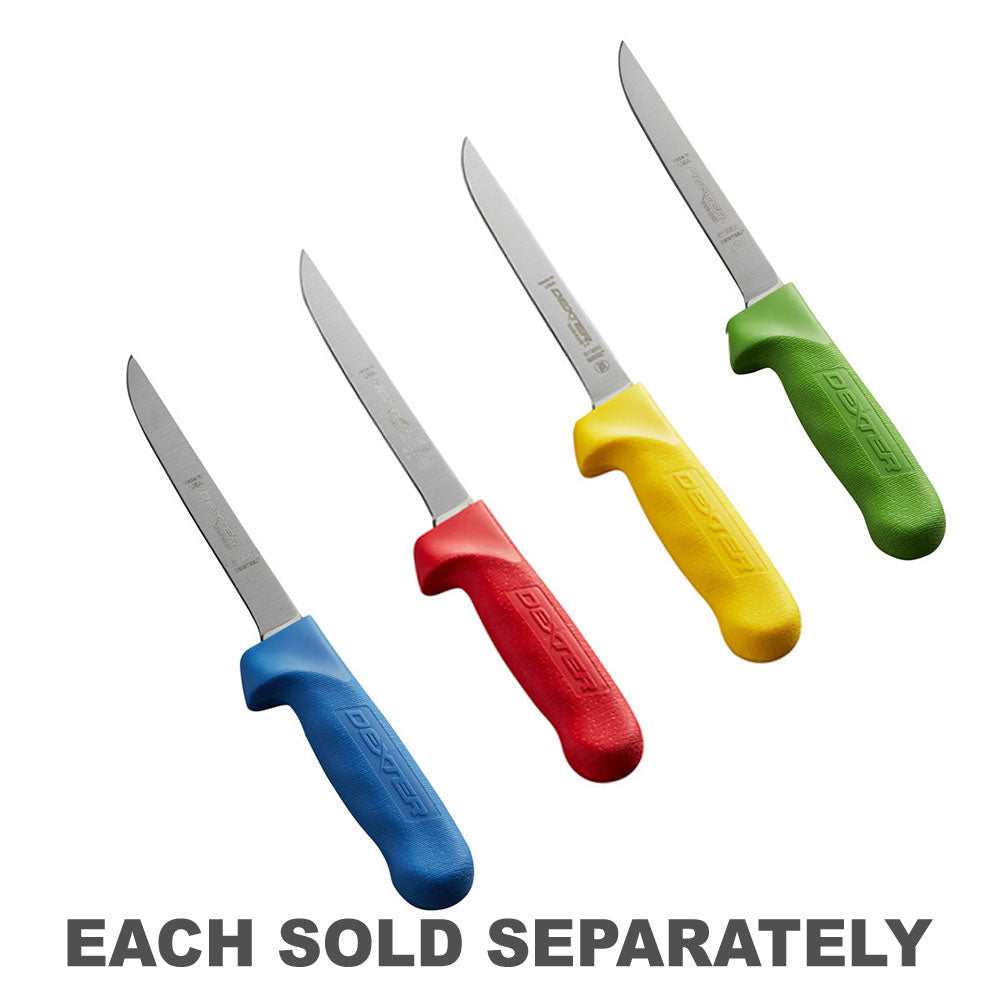 Cuchillo para deshuesar estrecho con mango de polipropileno de color azul. Construido para ser resistente e higiénico. Un mango de polipropileno texturizado, antideslizante y fácil de limpiar resiste temperaturas altas y bajas. Un sello impermeable entre la hoja y el mango proporciona la máxima calificación sanitaria. Hoja de acero con alto contenido de carbono que no mancha, con un borde afilado y rectificado individualmente, excelente para uso comercial.
