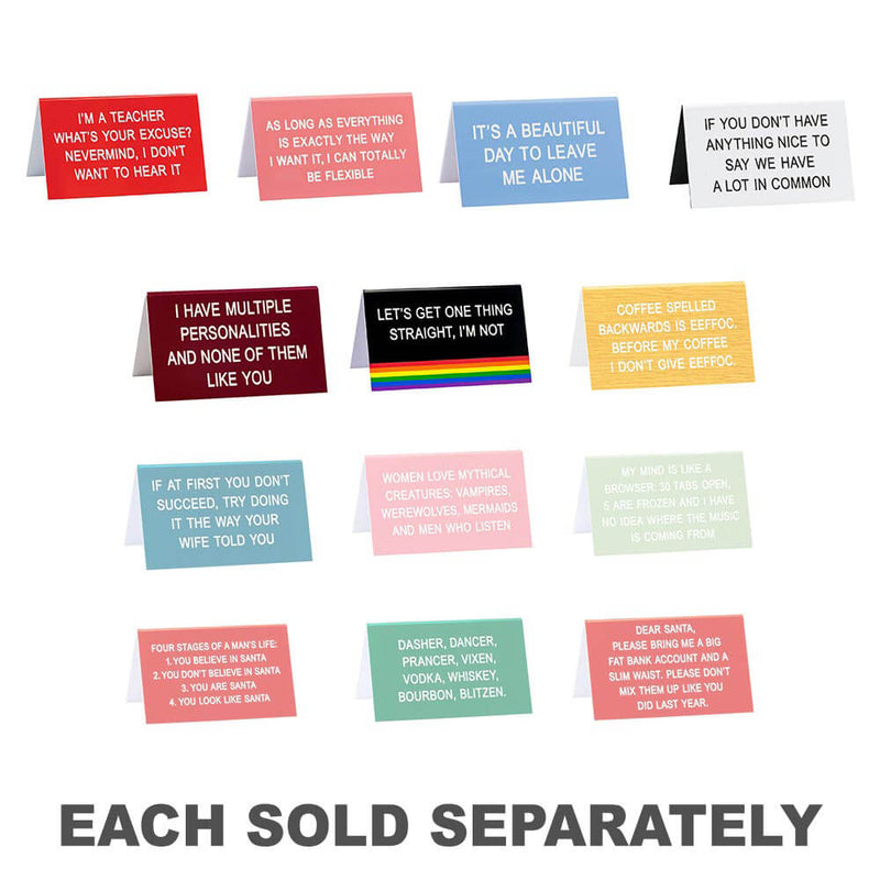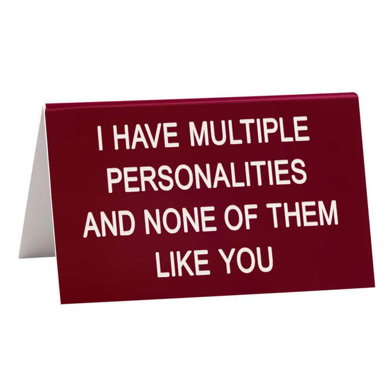 Rompe la monotonía del trabajo y trae algunas LOLs a la oficina con este letrero de escritorio en color burdeos de SAY WHAT?. El título dice: "Tengo múltiples personalidades y a ninguna de ellas le gustas". El producto mide 11,5 cm x 7 cm.