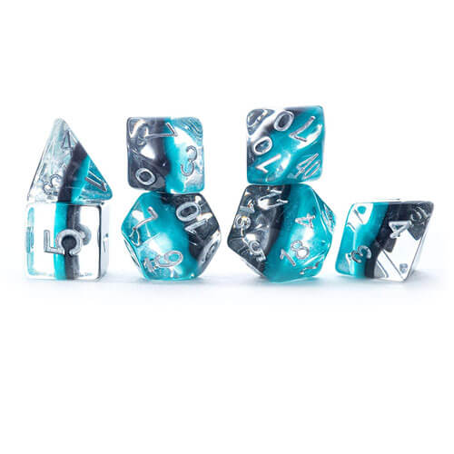• Colores: negro medianoche y sueños de verde azulado - Numeración de plata. Los dados Eclipse son dados en capas (4) que presentan dos finas capas de color nacarado brillante ubicadas entre dos capas exteriores transparentes perfectamente claras.