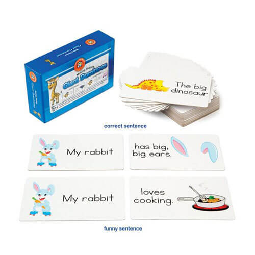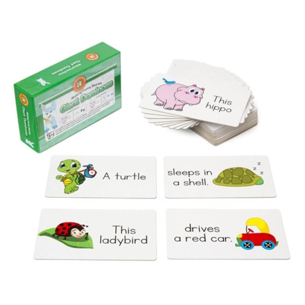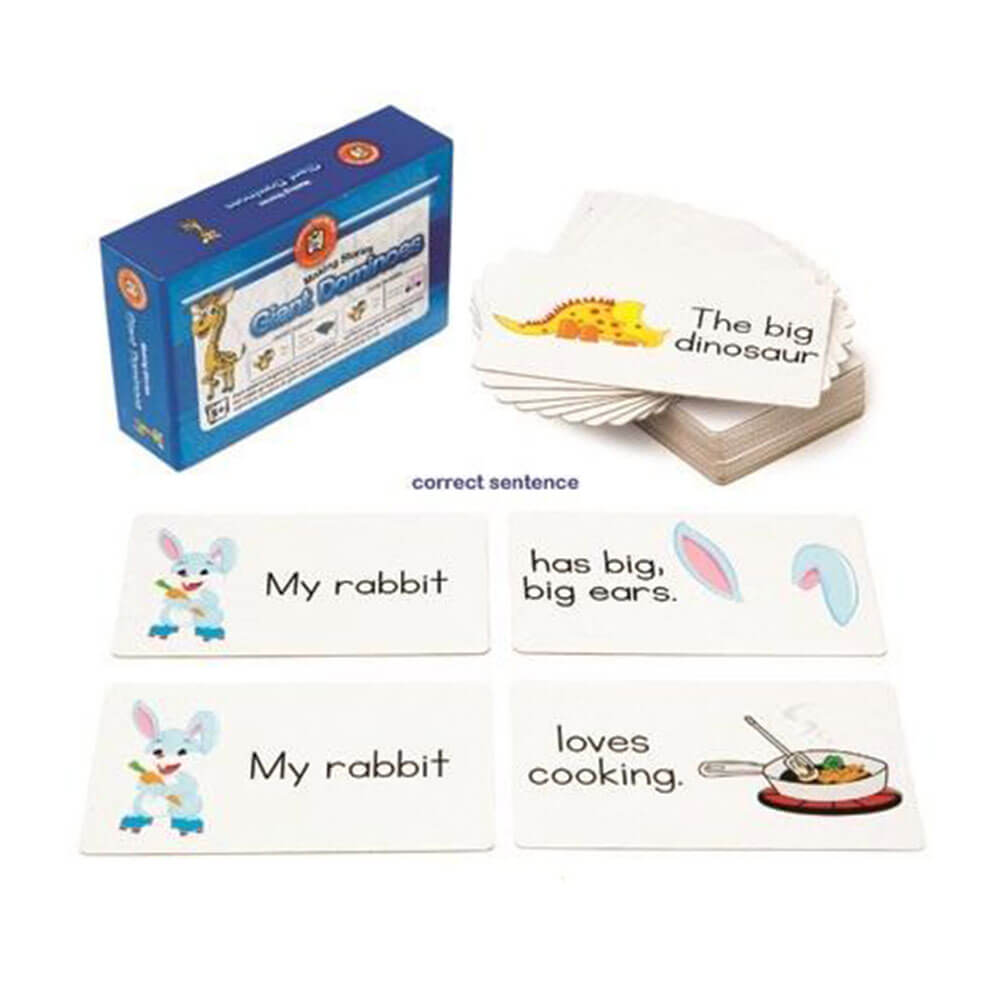 Este aprendizaje puede ser divertido Aún así, crear historias es divertido. Las fichas de dominó son una excelente herramienta de aprendizaje que se puede utilizar para aprender sobre la construcción de oraciones. Cada oración se divide en 2 secciones y se puede combinar con el final correcto o puedes ser creativo y combinarla con otro final. Se pueden utilizar en interiores o exteriores, ya que el tapete de tela tiene un respaldo de vinilo que se puede limpiar fácilmente.