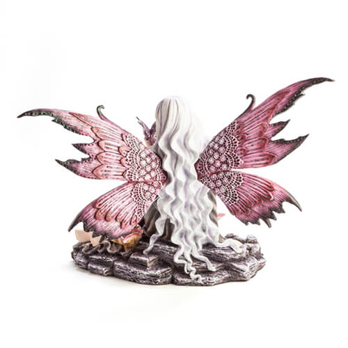- Hada de pelo lila alimentando a un pequeño dragón con una flor