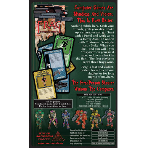 Frag is a computer game without a computer. It's a "first-person shooter" on a tabletop. Move your fighter and frag your foes; draw cards for weapons, armor, and gadgets; move through the blood spatters to restore your own health! If you die, you respawn and come back shooting!