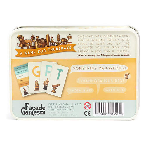 - Detalles: Juega este juego de 5-15 minutos con 2-30 jugadores de 8 años de edad. Los trofeos incluyen 70 tarjetas de trofeos únicas, 350 temas y un trofeo de metal pequeño para el ganador.