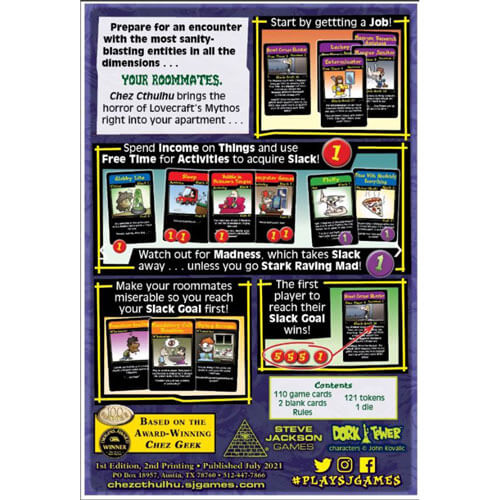 Prepárese para un encuentro con las entidades más explosivas de cordura en esta o cualquier dimensión. . . tus compañeros de cuarto. Chez Cthulhu combina el clásico sistema Chez Geek con el Dios mayor favorito de todos, se agita en una nueva mecánica de locura y da un parto antinatural a un juego independiente diseñado por Steve Jackson e ilustrado por John Kovalic.