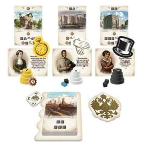 Cada jugador comienza el juego con una tarjeta de inicio aleatoria, los recursos representados en la parte superior de esa tarjeta y cuatro discos de colores con un valor del 1 al 4.