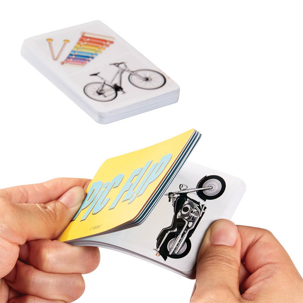 • Los jugadores hojean sus cartas para conectar imágenes, encontrar coincidencias y deshacerse de todas sus cartas. Una vez que se encuentra una coincidencia, se anuncia otra inmediatamente y la búsqueda continúa, así que piense rápido, porque el primer jugador que se deshaga de toda su mano es el ganador. Para 2 a 6 jugadores de 7 años en adelante.