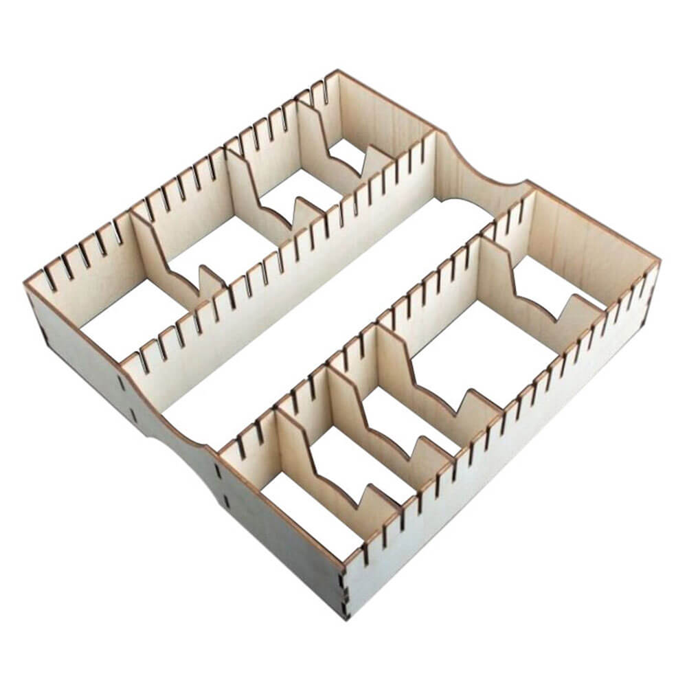 Diseñado para cajas de juegos normales con dimensiones interiores de 286x286x66mm. (Ejemplo: Dominio, Terror Eldritch, Colonia...). Este organizador fue diseñado para tarjetas con fundas y proporciona dos filas de almacenamiento de tarjetas más una fila adicional para fichas y cualquier otra cosa.