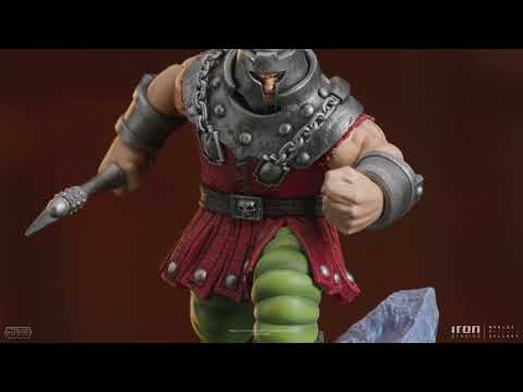 Con pasos pesados entre las rocas de las llanuras del Planeta Eternia, un pequeño y robusto guerrero blandiendo su hacha de batalla corre listo para usar sus poderosas piernas como espirales para literalmente empujar su cabeza contra sus oponentes. Usando su rústico casco de metal plano, con una enorme armadura que cubre la parte superior del cuerpo, unida por cadenas en su pecho sobre una túnica roja, este intrépido guerrero heroico se presenta en la estatua "Ram-Man BDS - Masters of the Universe -Art Escala 1/10" de Iron Studios.