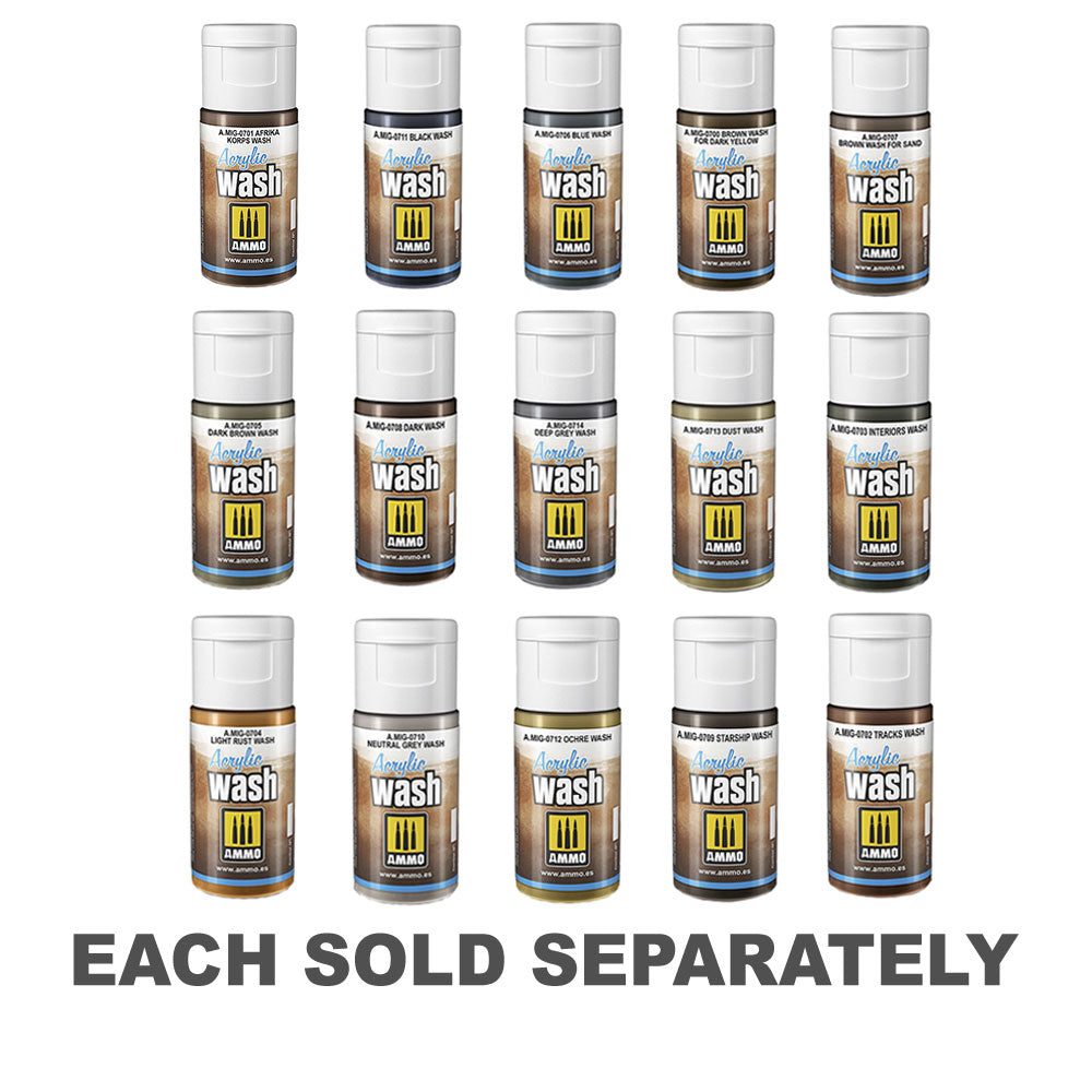 Los lavados son una de las técnicas de modelismo más antiguas y esenciales, utilizada por todos los modelistas en temas y dioramas de todo tipo y temática. Desarrollado con dos formulaciones diferentes para incluir tanto el tipo esmalte como el tipo acrílico. Cada tipo presenta diferentes calidades para adaptarse a la variedad de necesidades de nuestros modelos y a las preferencias de cada demanda modelista. Ambos ofrecen excelentes resultados y son muy fáciles de aplicar. La ventaja del lavado acrílico es que no tiene toxicidad ni olor por lo que usarlo en casa o cerca de tu familia no es un problema, y se seca más rápido que el lavado de esmalte lo que te permite terminar el proceso en un tiempo valorado más corto. . El wash acrílico viene en una botella con un tapón dosificador que permite colocar unas gotas en una paleta o recipiente para su uso posterior. Aunque la capacidad de la botella es de 15 mL, el dosificador permite ahorrar producto y trabajar con mayor precisión. Estos nuevos lavados vienen en una amplia gama de colores para que puedas tener todas las opciones para tu