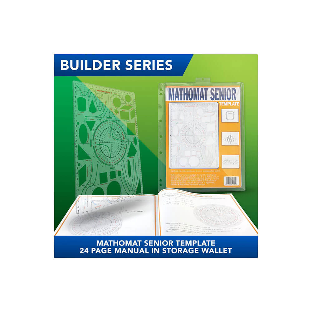 Mathomat Senior ha sido desarrollado específicamente para dibujar y presentar trabajos de secundaria. Mathomat Senior incluye un transportador central que es también el círculo unitario para el estudio de la trigonometría. Una recta tangente que se puede utilizar con el círculo unitario. Graficar curvas de distribución de frecuencia normal, seno, coseno, tan, cuadrática, cúbica, parabólica, hipérbola y. Mathomat Senior incluye formas y bocetos de contornos para sólidos 3D utilizados en el cálculo de áreas y volúmenes.