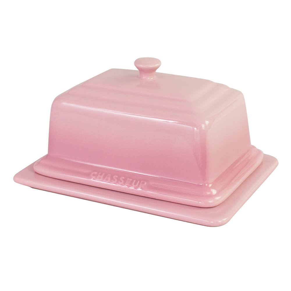 Bellamente hecha a mano, esta mantequillera en color Cherry Blossom tiene el Chasseur nombre impreso en la base y presenta una superficie esmaltada brillante y duradera.