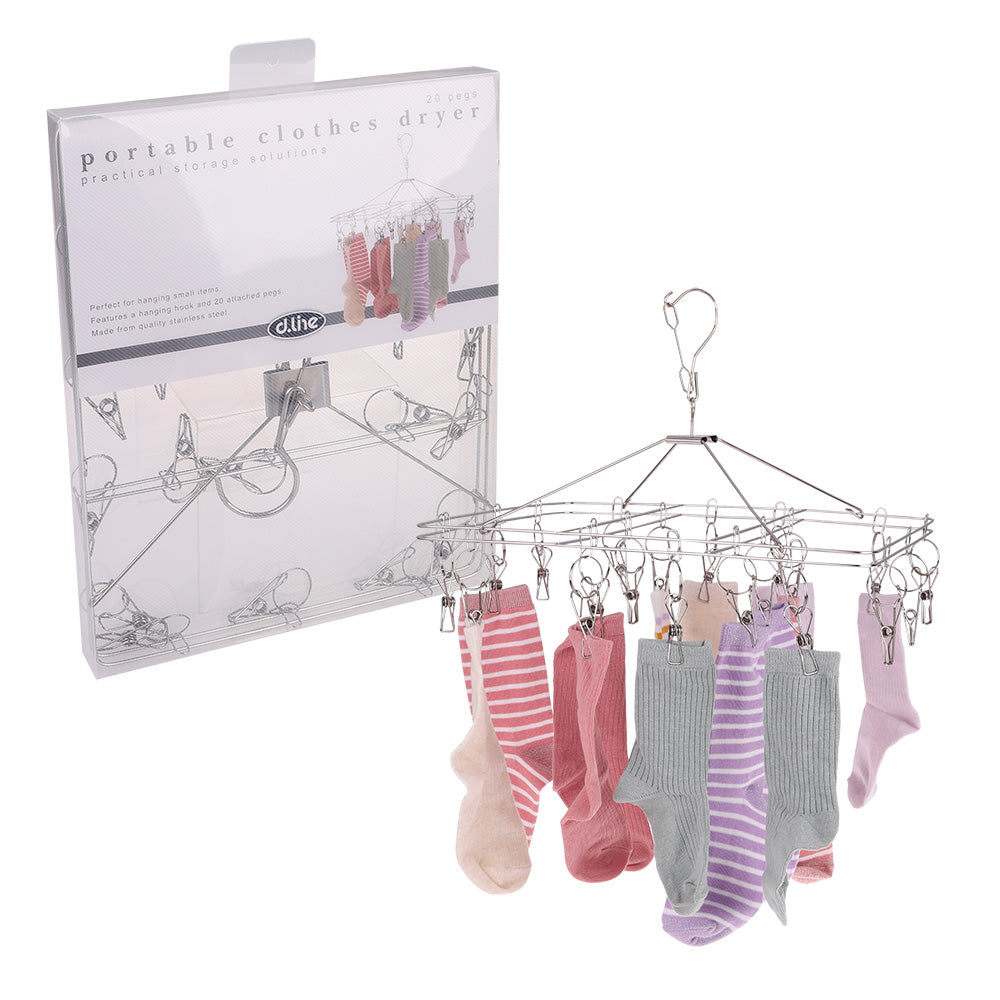 Esta secadora de ropa rectangular de acero inoxidable: 20 clavijas de D. La línea es perfecta para colgar artículos pequeños, incluso en el espacio más compacto. Con un gancho colgante y 20 clavijas adjuntas, este secador compacto es ideal para viajar y se pliega para un fácil almacenamiento.