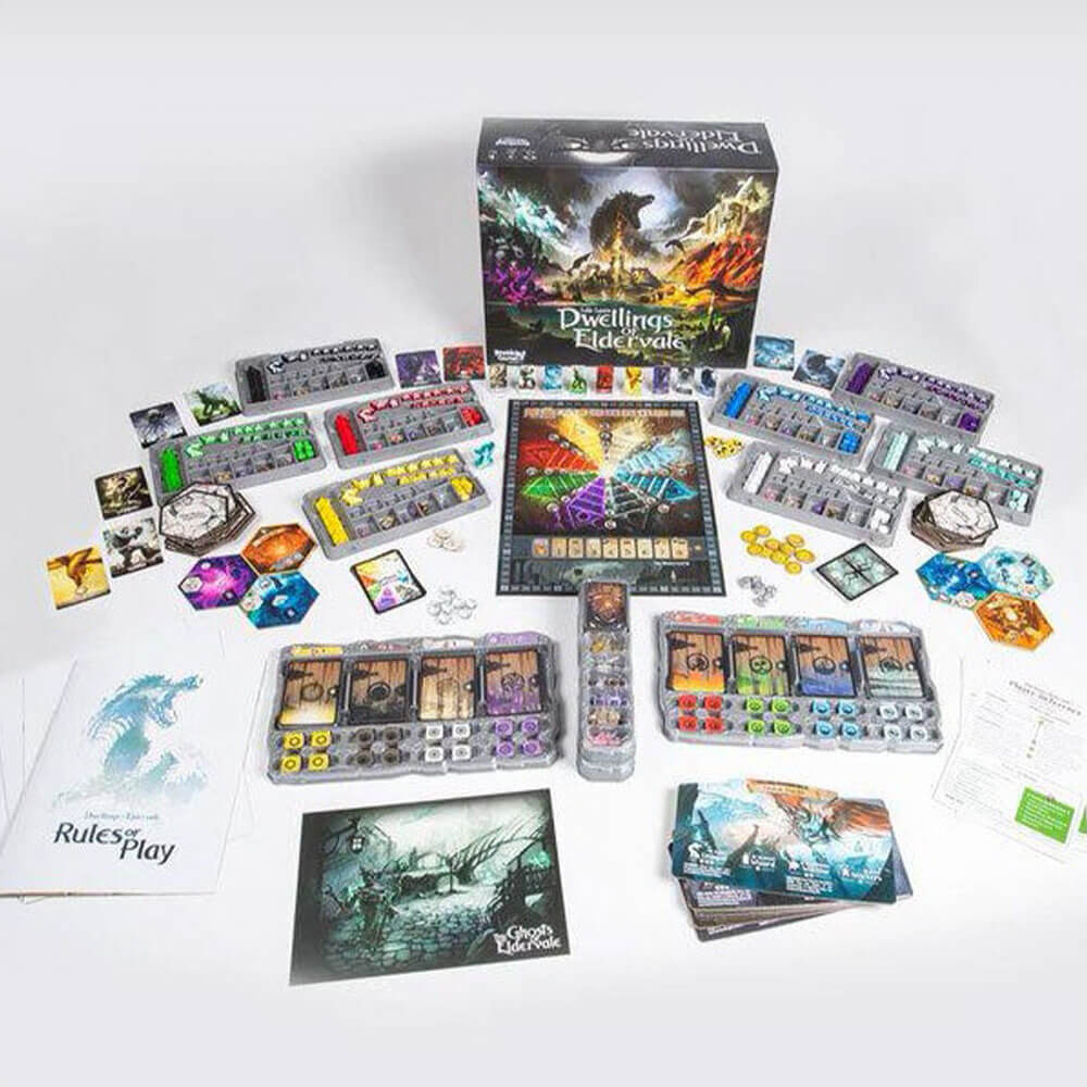 Dwellings of Eldervale es un juego épico de colocación de trabajadores ambientado en un mundo mágico que alguna vez estuvo perdido. Monstruos elementales gigantes deambulan mientras dragones, magos y guerreros luchan por el dominio de 8 reinos elementales. Los jugadores controlan facciones únicas que buscan aventuras, batallas, crecer en poder y, en última instancia, habitar Eldervale, dándole forma según su visión. La edición estándar incluye: 8 tapetes de jugador de doble cara en Gametrayz personalizado, 6 mazmorras, recursos, maleficio, Gametrayz central, 72 Meeples personalizados, 8 colores de jugador, 48 viviendas de Meeple personalizadas, 8 colores de jugador, 48 marcadores de puntuación de madera, 8 colores de jugador, 53 dados D6 veteados, 8 colores de jugador/monstruo, 1 marcador elemental y inframundo, 32 fichas hexagonales elementales y de ruina únicas, 24 cartas de modo individual de Ghosts of Eldervale, 1 tapete de juego de Ghosts of Eldervale y 1 tablero de juego de Ghosts of Eldervale. Watcher Meeple, 60 cartas mágicas, 104 cartas de aventura, con arte de fantasía único, 8 cartas de facción de jugador inicial, 9 cartas de monstruo, arte/habilidades personalizadas, 9 monstruos de pie y más. 12 soportes de plástico, 9 "orbes" de cuentas de vidrio, 120 recursos de cartón, 10 tácticas y trucos de cartón. Fichas de tesoro, 5 ayudas de referencia para jugadores y folleto de apéndice.