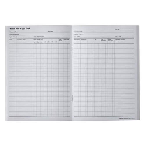 Este mini libro de salarios Wildon 171W es una manera fácil y eficiente de registrar tarifas por hora y horas de trabajo durante una semana laboral de 7 días. Este libro está preimpreso, por lo que todo lo que tienes que hacer es completar tus datos. Este libro incluye secciones para nombres, premios, fecha de nacimiento, tarifas, horas, impuestos, asignaciones, jubilación y más.